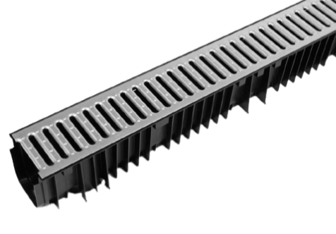 Body of channel in PE-HD with a flat edge and without a containing frame, furnished with a grating with extremities that cover the entire channel area.